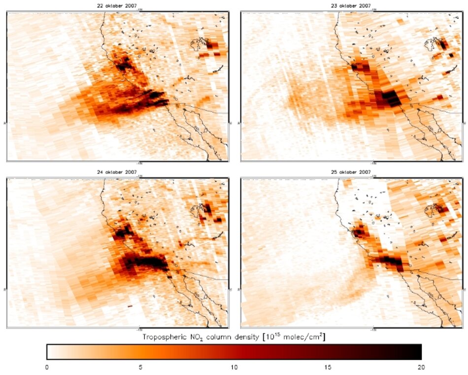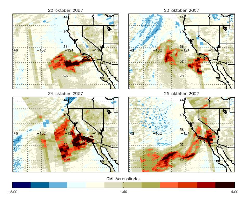 In de hiernaast afgebeelde OMI-satellietopnamen van de bosbranden is duidelijk te zien hoe de krachtige oostenwind, die de branden zo sterk aanwakkerde, de NO2 en aerosolen tot ver boven de Stille Oceaan blaast. Aerosolen zijn minuscule vaste en vloeibare deeltjes in de atmosfeer. De NO2 hoeveelheden die bij de branden in Californië zijn gemeten worden normaal alleen in zeer vervuilde (geïndustrialiseerde) gebieden gemeten. De autoriteiten in Californië hebben de inwoners gewaarschuwd voor zeer gevaarlijke luchtvervuiling.