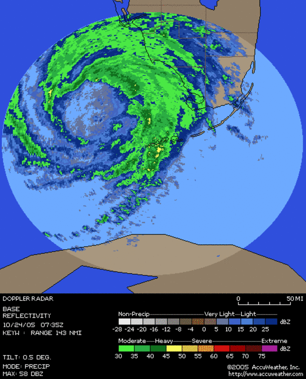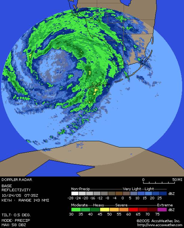 Het oog van de orkaan trok op 24 oktober precies over zuid-Florida. In het oog was het ogenschijnlijk rustig, zonnig weer. Ervoor en erna kwamen windsnelheden voor van categorie 2 en 3 op de schaal van Saffir Simpson. Naast hevige regenval kwamen er ook tornado's voor. Zie radarbeeld met regenval Wilma onderaan deze pagina.