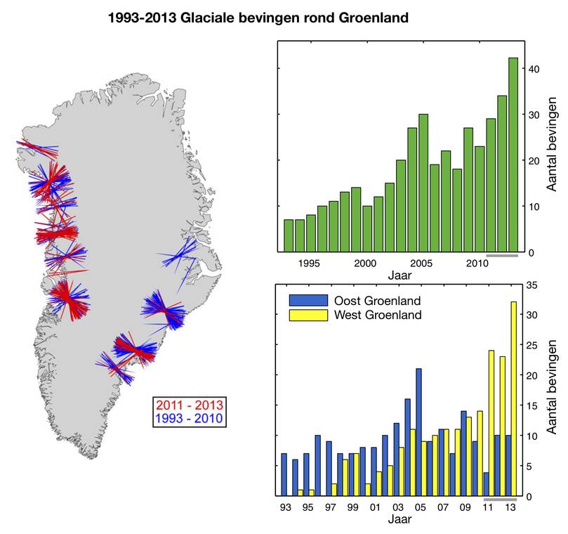 Analyse van glaciale aardbevingen in Groenland laat zien dat dit type signaal met name in de zomermaanden voorkomt. Tevens laten sommige gletsjers een sterke toename in aardbevingen zien over recentere jaren (figuur 3). Zo dragen seismologische metingen bij aan de monitoring van het afkalven van gletsjers en geven inzicht in het stroomgedrag van individuele gletsjers.