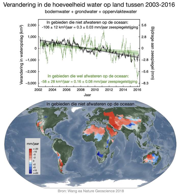 Met behulp van metingen van de variaties in het zwaartekrachtsveld van de aarde door de Grace satelliet, kunnen de variaties in wateropslag op het land in de vorm van oppervlaktewater, bodemwater en grondwater worden afgeleid. Een studie uit 2018 concludeert dat er tussen 2002 en 2016 systematisch water van het land naar de oceaan is verplaatst en dat de wateropslag op het land daardoor met gemiddeld 164 kubieke kilometer per jaar is afgenomen (figuur 1).