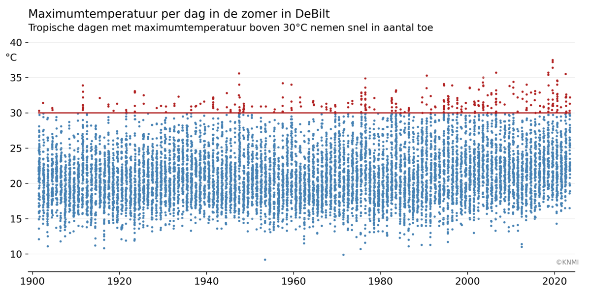 We spreken van een tropische dag als overdag de temperatuur 30 graden aantikt. Door van iedere zomerdag sinds 1901 de maximumtemperatuur met een punt weer te geven, zien we hoe het aantal tropische dagen in de loop van de tijd verandert (figuur 1, rode punten). Aan het eind van de meetreeks zien we ze veel vaker optreden. Op het oog schuiven alle meetwaardes richting hogere temperaturen.