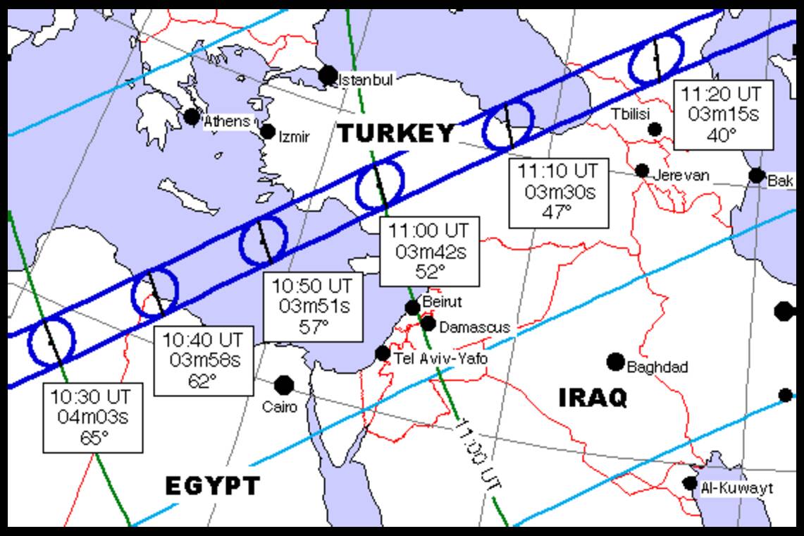 In delen van Afrika en Azië en een smal gebied van de Middellandse Zee tussen Kreta en Cyprus en over Turkije en Georgië was de zonsverduistering totaal. De weersatelliet Meteosat MSG volgde de zonsverduistering op de voet. De Europese satellietorganisatie Eumetsat maakte een animatie van beelden van de satelliet.