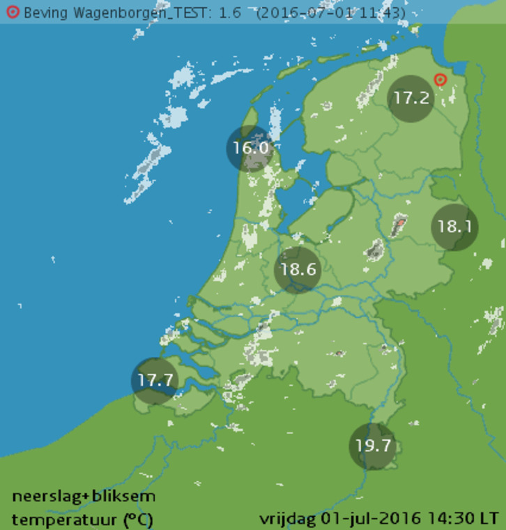 Boven deze rode stip wordt de plaats vermeld met de magnitude ofwel sterkte van de aardbeving. Meer informatie over de aardbeving is te zien op de pagina Seismologie onder Nederland Nu. De meldingen van aardbevingen op de KNMI-neerslagradarkaart worden gedaan op basis van automatische metingen door de seismologische meetstations.