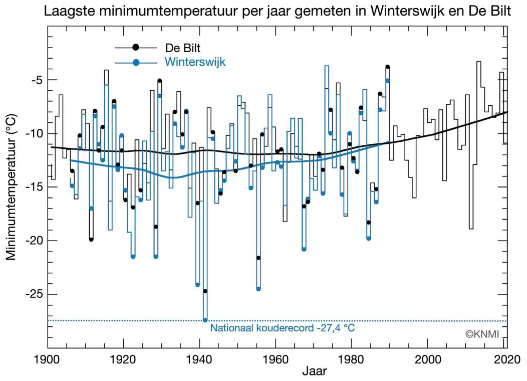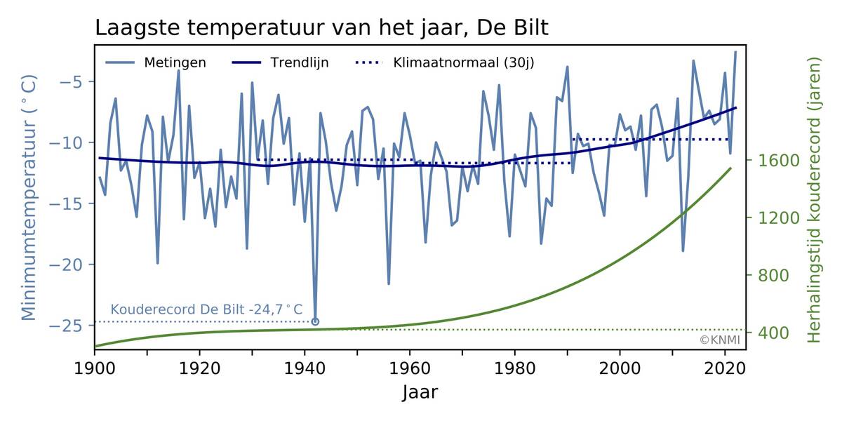 Een temperatuur van -24,7 °C in De Bilt komt in het huidige klimaat ongeveer eens in de 1600 jaar voor. In 1942, toen de wereldgemiddelde temperatuur 0,8 °C lager was dan nu, kwam deze temperatuur ongeveer eens in de 400 jaar voor (figuur 3). Een koude dag in De Bilt is nu ongeveer 2 °C warmer dan toen. Voor de recordlage -27,4 °C in Winterswijk verwachten we vergelijkbare herhalingstijden en trend. Dat het kouderecord van Winterswijk nog wordt verbroken wordt steeds onwaarschijnlijker.