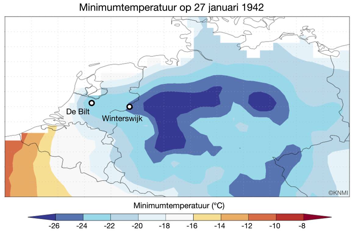 Uit de kaart van de minimumtemperatuur op 27 januari 1942 blijkt dat het koudste deel van Nederland inderdaad rond Winterswijk lag (figuur 2). In delen van Duitsland was het nog enkele graden kouder. In Eslohe, Sauerland, werd het -31,2 °C, ook daar de laagste temperatuur ooit gemeten.