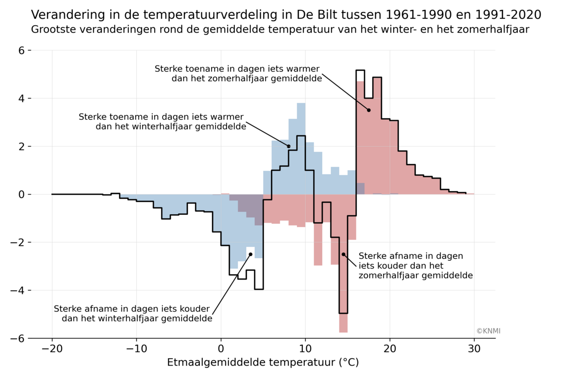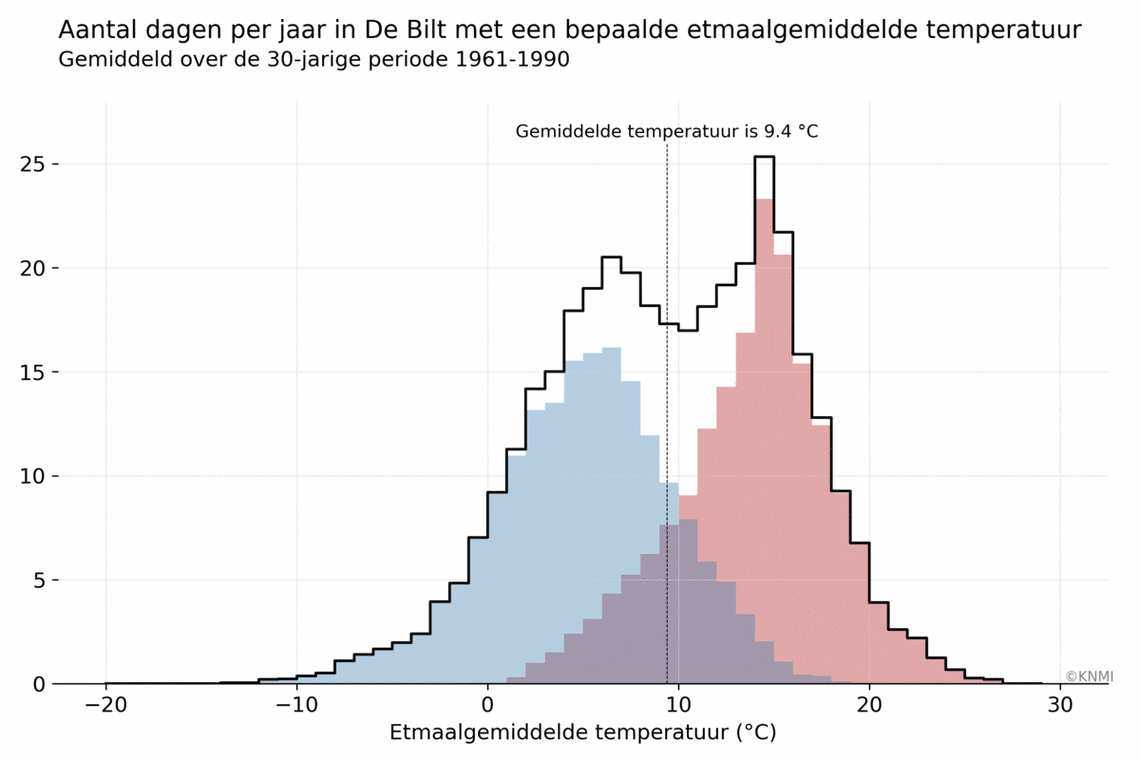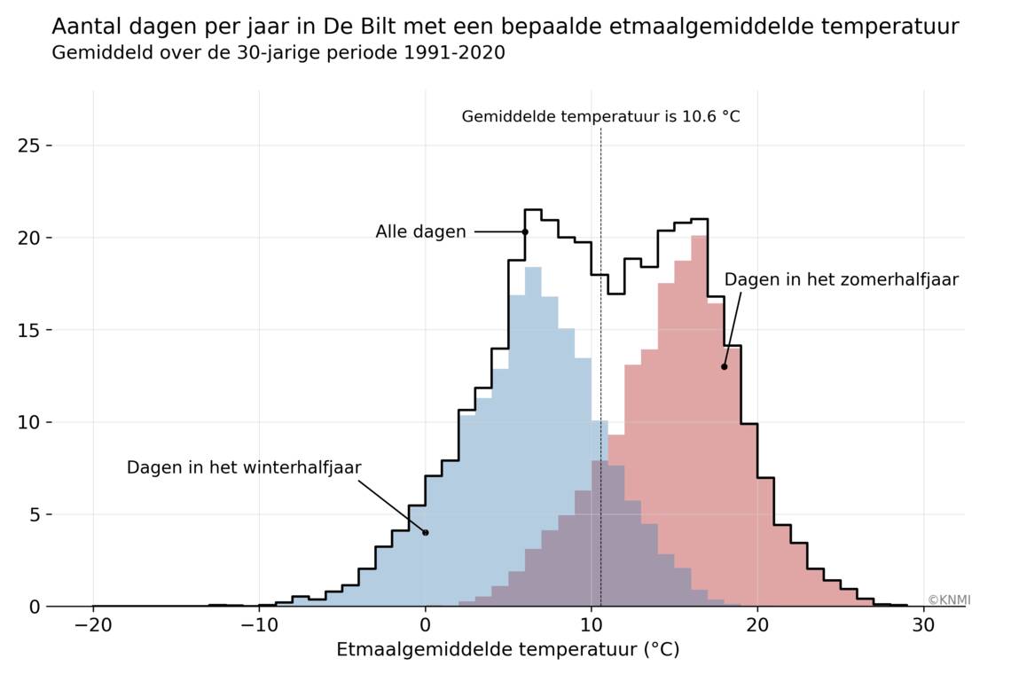 De temperatuurverdeling voor het zomer- en winterhalfjaar lijkt op een zogeheten normale verdeling: klokvormig, met de grootste aantallen in het midden en kleinere aantallen links en rechts daarvan. Als je deze twee verdelingen optelt tot de verdeling voor het hele jaar, krijg je een verdeling met twee maxima en daartussen een dipje. De twee maxima komen overeen met de temperaturen die in het zomer- en winterhalfjaar het meeste voorkomen.