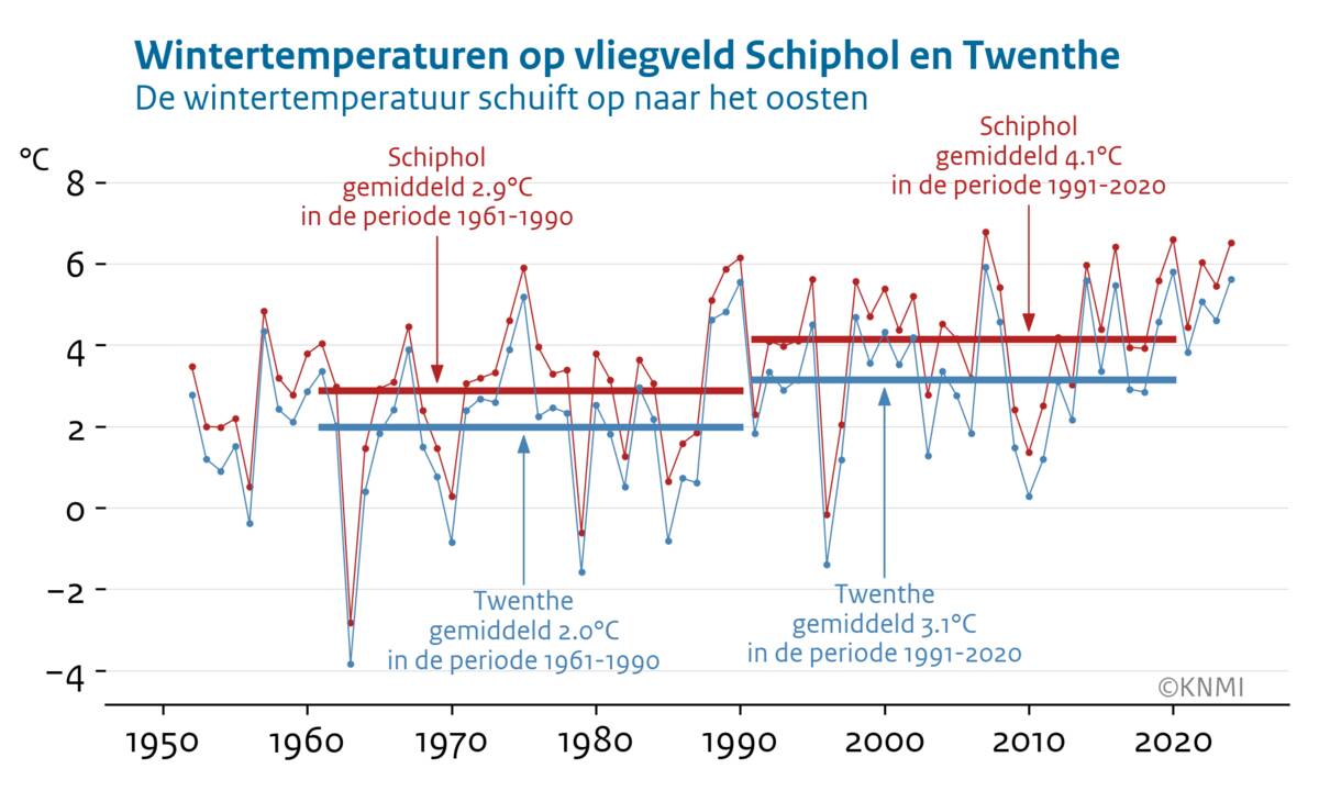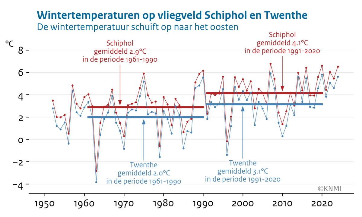 De afgelopen tijd is de temperatuur in heel Nederland gestegen, waardoor in de winter de temperatuur in Twenthe gemiddeld over 1991-2020 ongeveer even hoog was (3,1 graden) als in Schiphol 30 jaar eerder (2,9 graden, in 1961-1990). In Twenthe is in die 30 jaar de temperatuur met 1,1 graad gestegen, in Schiphol met 1,2 graad.
