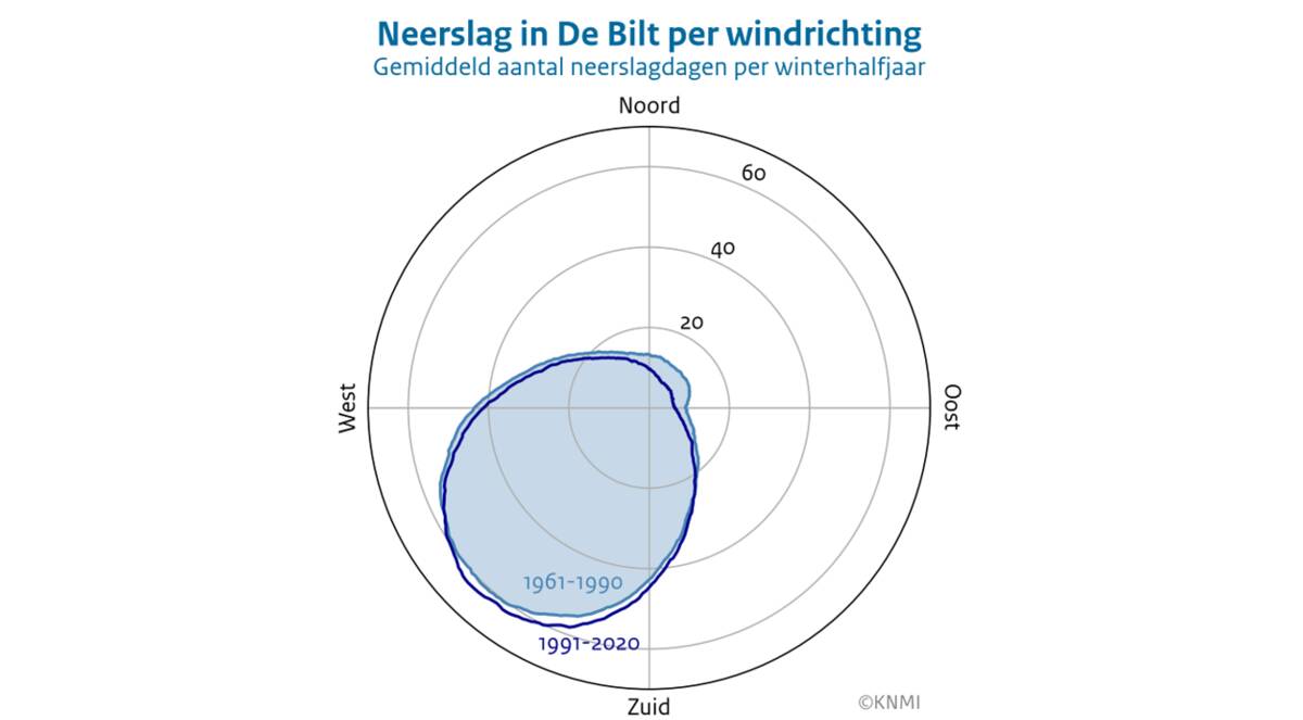 De veranderingen ten opzichte van de eerdere periode 1961-1990 zijn klein. Er zijn nu wat minder neerslagdagen met noordoostelijke wind, iets meer met zuidwestelijke wind. Het aantal neerslagdagen is nauwelijks veranderd, gemiddeld valt op 102 van de 182 dagen in het winterhalfjaar neerslag, een kans van 56 procent op een natte dag.