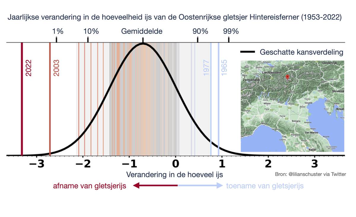 De zomer van 2022 was in een groot deel van Europa extreem warm, droog en zonnig, met droogte en lage rivierstanden tot gevolg. Ook voor de Alpengletsjers was deze extreme zomer slecht nieuws. Inmiddels is voor een groot aantal gletsjers in de Alpen de balans opgemaakt. Wat blijkt: in 2022 hebben de Alpengletsjers meer ijs verloren dan ooit gemeten. Het ijsverlies bleek zelfs nog extremer dan in het recordjaar 2003. Dit geldt ook voor de Hintereisferner, een gletsjer in het zuidwestelijk deel van Oostenrijk (figuur 1). Het massaverlies was zelfs vier keer zo groot als in een gemiddeld jaar (figuur 2). Ook bij vele andere gletsjers in de Alpen is het massaverlies twee tot vier keer zo groot als gemiddeld.