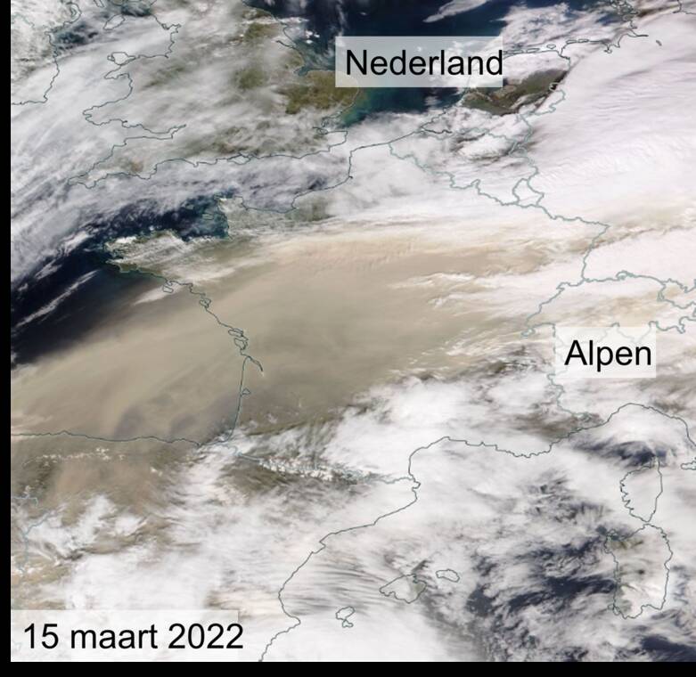 Ook de winter en de lente droegen hun steentje bij. In de winter viel namelijk relatief weinig sneeuw. Een witte sneeuwlaag is als een ‘beschermdeken’ voor de gletsjers: het reflecteert zonlicht en isoleert het gletsjerijs. Deze beschermdeken was dit jaar erg dun. Bovendien werd de sneeuw in de lente bruin gekleurd doordat de wind op meerdere dagen grote hoeveelheden Saharazand richting de Alpen voerde (figuur 3). De donkere sneeuw absorbeerde meer zonlicht en smolt daardoor sneller weg. Het gevolg was dat het sneeuwdek eind juni al net zover was afgenomen als normaal in augustus.