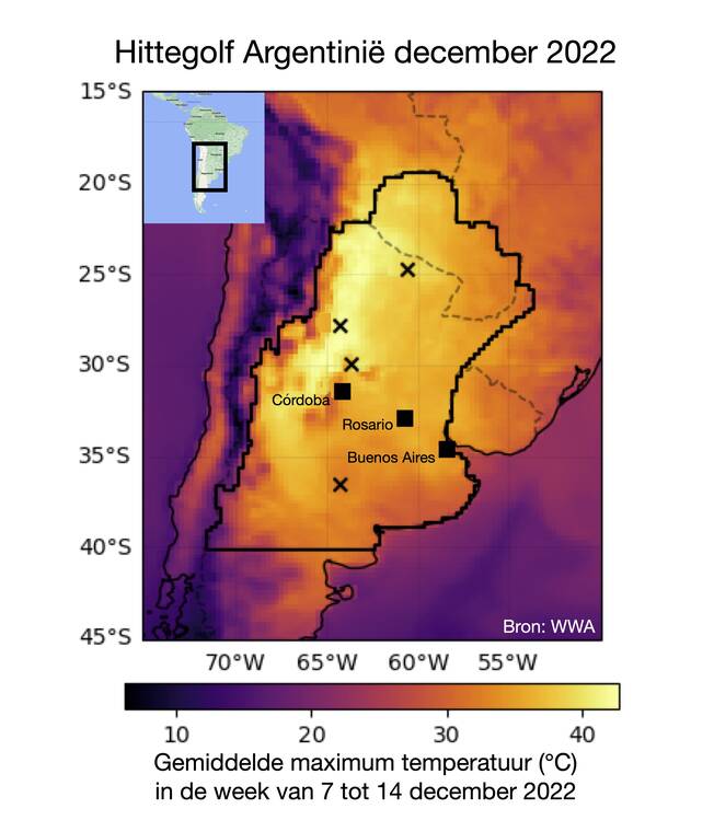 Het onderzoek naar de rol van klimaatverandering bij extreem weer heet klimaatattributie. Bij hittegolven vinden we vaak een verband tussen extreem weer en klimaatverandering: hittegolven worden bijna overal ter wereld extremer door klimaatverandering. De hittegolf in Argentinië en Paraguay van afgelopen december bijvoorbeeld is nu ongeveer 60 keer waarschijnlijker is door klimaatverandering. Tijdens die hittegolf steeg op verschillende plaatsen de maximumtemperatuur een week lang gemiddeld boven de 40 graden (figuur 1).