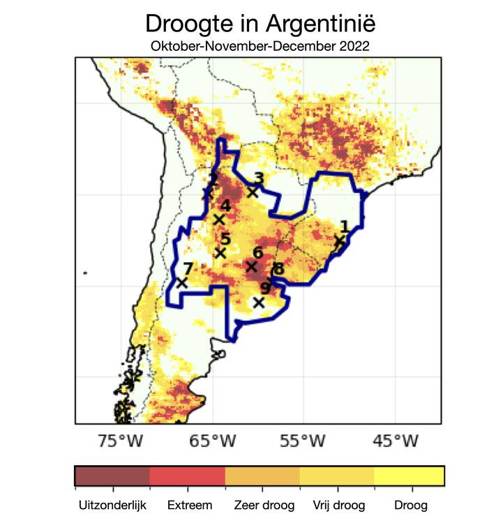 Een voorbeeld van een studie waar de link met klimaatverandering niet direct zichtbaar is de huidige droogte in Argentinië (figuur 2). De link tussen klimaatverandering en droogte is vaak lastig te leggen. Een droogteperiode heb je doorgaans maar een enkele keer per jaar. Je hebt dus gegevens van heel veel jaren nodig om een trend te zien. Bovendien speelt toeval een grote rol. Met toeval bedoelen we dat het klimaat van nature varieert. Toevallig een aantal jaren met droogtes betekent daardoor nog niet dat klimaatverandering hiervan de oorzaak is. Voor temperatuur speelt toeval een veel kleinere rol en is de invloed van klimaatverandering sneller merkbaar.
