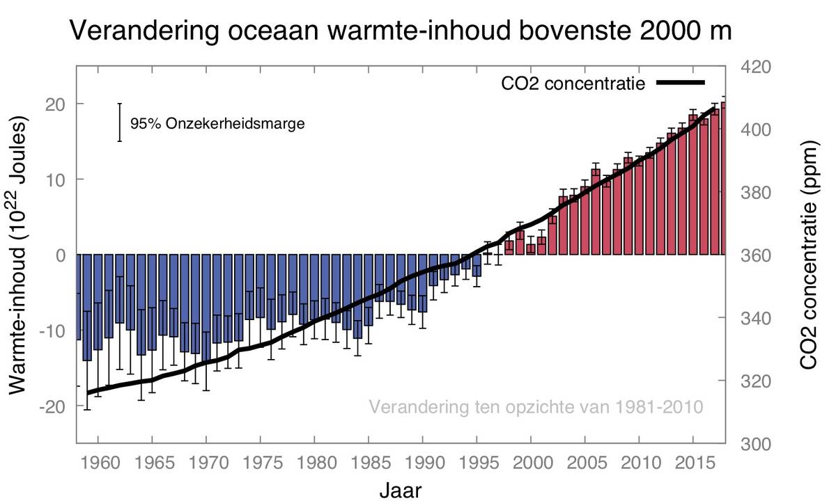 De warmte-inhoud van de oceaan wordt steeds beter gemeten (Figuur 1). Voor 2005 waren de metingen vrij grofmazig en vaak beperkt tot de bovenste 700 m. In dat jaar bereikte het Argo netwerk van autonome meetboeien zijn operationele dekking, en sindsdien hebben we een vrij nauwkeurig beeld van de ontwikkeling van de warmte-inhoud van de oceaan. Over de periode 2005-2017 correspondeert de opwarming van de oceanen met een warmteopname van ongeveer 0,6 Watt per vierkante meter, een waarde die goed overeenkomt met de resultaten van klimaatmodellen. In de periode voor 2005 is de warmte-inhoud van de oceanen volgens een betere methode opnieuw bepaald uit de metingen. Ook voor deze periode kloppen de modellen nu beter met de metingen.