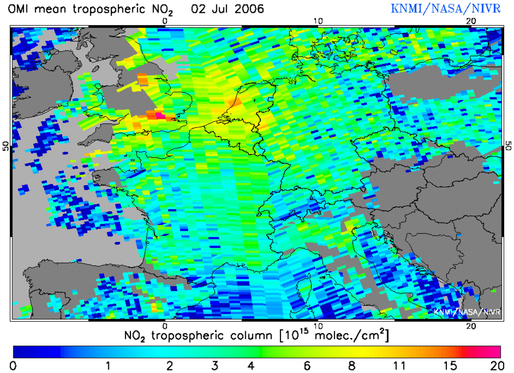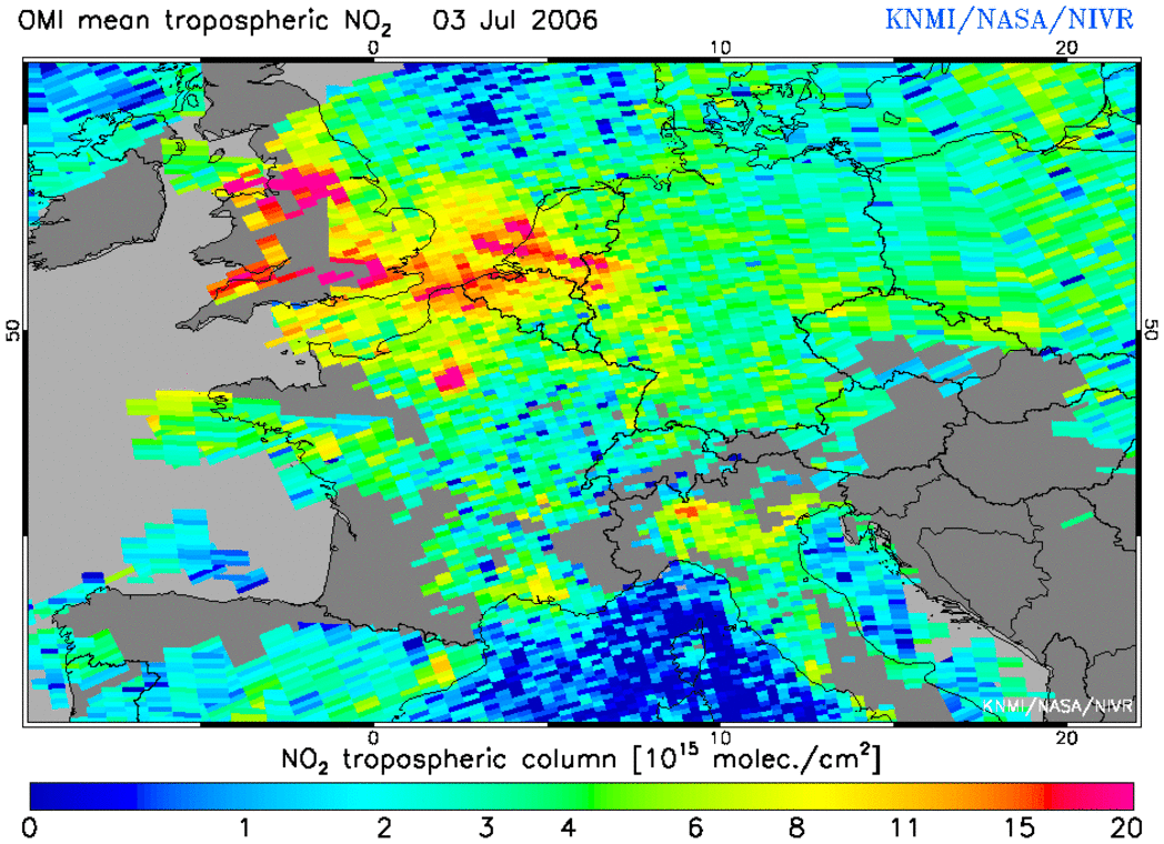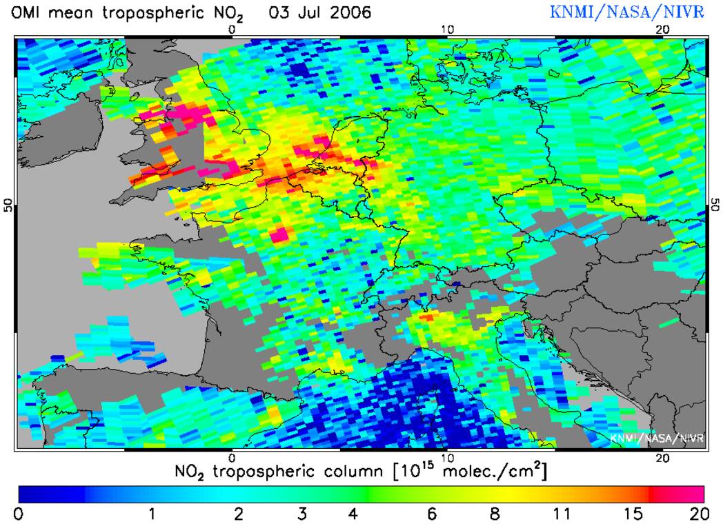 * De beide afbeeldingen (in en onder dit bericht) tonen de stikstofdioxide in de onderste kilometers van de atmosfeer gemeten door het Ozone Monitoring Instrument (OMI) op zondag 2 juli en maandag 3 juli 2006. De satelliet laat zien dat er op maandag meer stikstofxyde boven Nederland in de atmosfeer zit dan op zondag. Hoofdoorzaak is het drukkere verkeer op maandag.