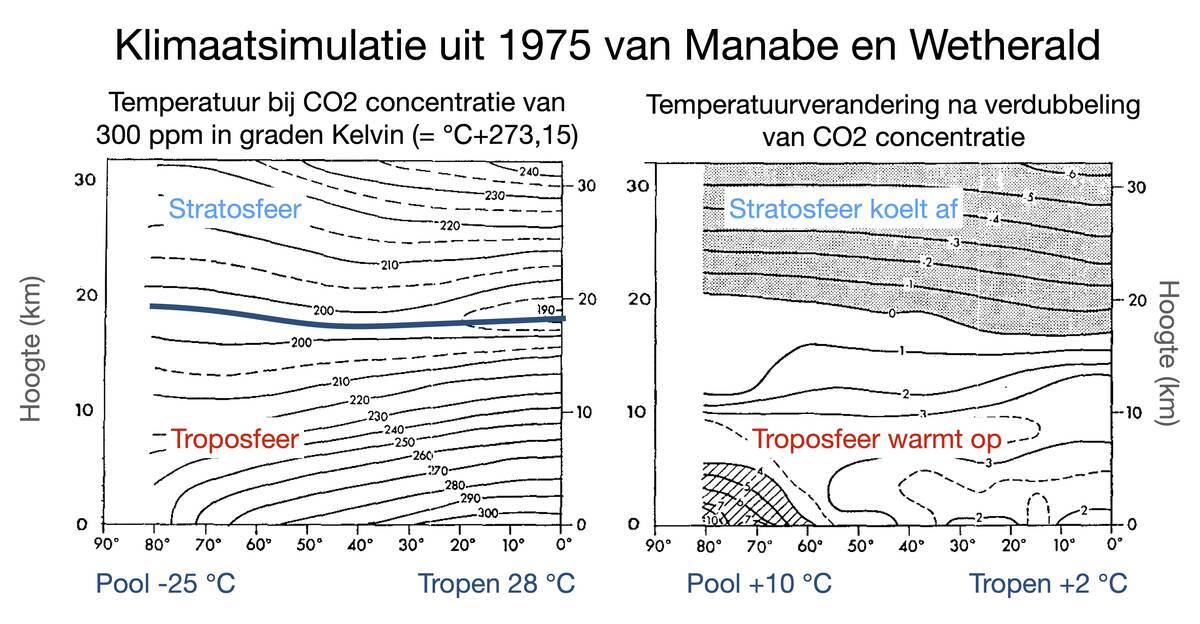 Later breidde hij dat 1-dimensionale model uit tot een 3-dimensionaal ‘general circulation model’ (GCM). Dit model projecteerde een temperatuurstijging van 2,9 ℃ bij een verdubbeling van de CO2-concentratie (figuur 1), wat verrassend goed overeenkomt met de schatting uit het laatste IPCC klimaatrapport dat de werkelijke waarde waarschijnlijk ligt tussen 2,5 en 4 ℃. Uiteindelijk ontwikkelde hij met oceanograaf Kirk Bryan het eerste gekoppelde atmosfeer-oceaanmodel. Met deze modellen legde hij de basis voor de huidige klimaatmodellen.