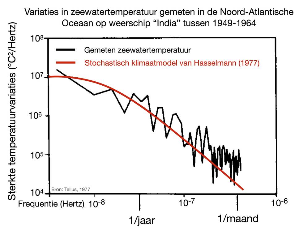 Hasselmann stond in de jaren zeventig aan de basis van de ontwikkeling van een geheel ander type modellen om variaties in het klimaat te beschrijven, de zogeheten stochastische klimaatmodellen. Hij zag in dat de snelle wisselingen in atmosferische winden door het komen en gaan van hoge- en lagedrukgebieden door de oceaan als ruis worden gezien. De oceaan integreert deze ruis tot langzamere variaties, zogenaamde ‘rode ruis’. Hij gaf daarmee een verklaring voor de waargenomen langzame variaties in zeewatertemperaturen (figuur 2).