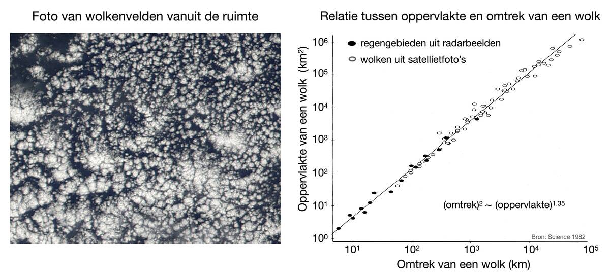 Analyse van satellietfoto’s van wolkenvelden geeft het verbluffende resultaat dat, wanneer je het oppervlak van elke wolk logaritmisch uitzet tegen de omtrek van de wolk, alle punten op een rechte lijn vallen (figuur 3). De helling hiervan, 1,35 ± 0,05, is gelijk aan de fractale dimensie van de wolkenrand. Deze fractale dimensie volgt uit de Kardar-Parisi-Zhang-vergelijking voor groeiende oppervlaktes. Large Eddy Simulaties (LES) op hoge resolutie van wolken geven hetzelfde resultaat, wat ons vertrouwen geeft dat de atmosferische turbulentie in deze modellen realistisch wordt beschreven.