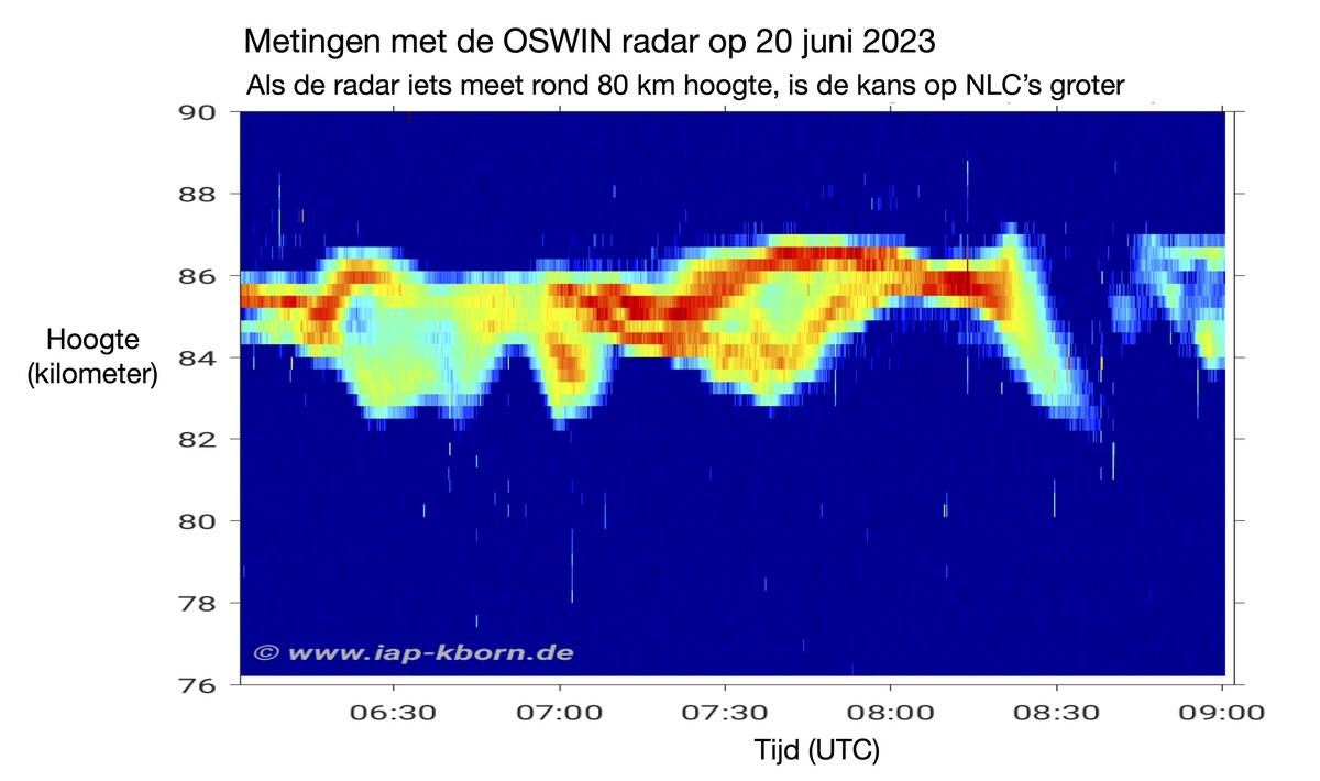 Om zelf NLC’s te spotten heb je ook een beetje geluk nodig. Er zijn momenteel nog geen echte verwachtingen voor NLC’s. Wel zijn er enkele manieren om de kans dat je ze kunt zien te vergroten. Zo is er een radar die de mesosfeer overdag in de gaten houdt (figuur 3). Als deze een sterk signaal geeft stijgt de kans om NLC’s in de volgende nacht waar te nemen maar het is geen garantie. Ook kun je webcams die richting het noorden kijken in de gaten houden. En er zijn ook enkele internationale facebook groepen waar mensen elkaar op te hoogte houden als NLC’s ergens worden gezien. Het loont dus zeker de moeite om in de zomer wat langer op te blijven en anderhalf uur na zonsondergang richting het noordwesten te kijken. Of om vroeg op te staan en tot anderhalf uur voor zonsopkomst te kijken in noordoostelijke richting.