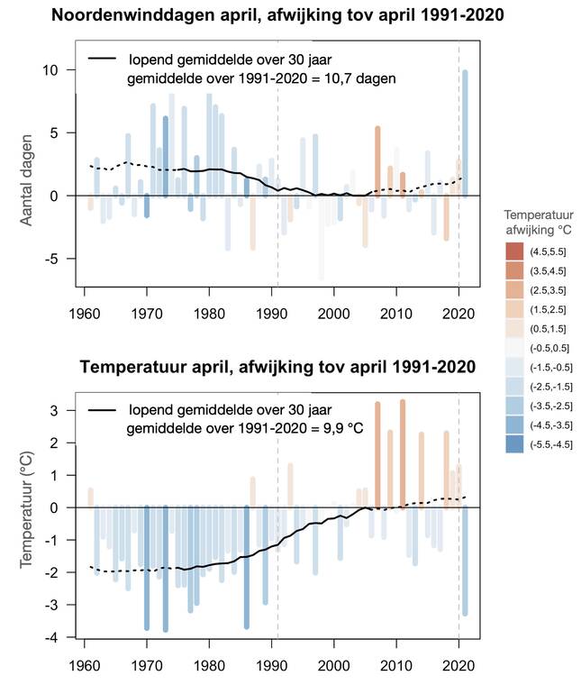 Wereldwijd warmt het klimaat geleidelijk op door de stijgende concentraties broeikasgassen, ook in Nederland. De variaties in noordenwind zorgen voor temperatuurschommelingen rond deze geleidelijk opwarmende trend. Dit wordt duidelijk als we het klimaat rond 1961-1980 vergelijken met 1991-2020 (figuur 3). Gemiddeld is de temperatuur in april nu bijna 2 graden warmer dan rond 1975 (8 graden toen en 9,9 graden nu). Een deel van die opwarming hangt samen met het minder vaak voorkomen van wind uit de koude noordelijke richtingen (34% toen en 25% nu) en vaker wind uit het doorgaans warmere zuiden (20% toen en 25% nu).