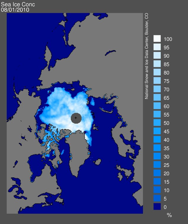 In het Noordpoolgebied is momenteel iets meer zeeijs dan in deze tijd van het jaar gemeten in recordjaar 2007. Het ijsoppervlak is echter duidelijk minder dan in de jaren 2005, 2006, 2008 en 2009. Op de Zuidpool – waar het nu winter is – is het zeeijs toegenomen. De oppervlakte van het zeeijs was vorige maand groter dan ooit in een julimaand gemeten is sinds 1978.