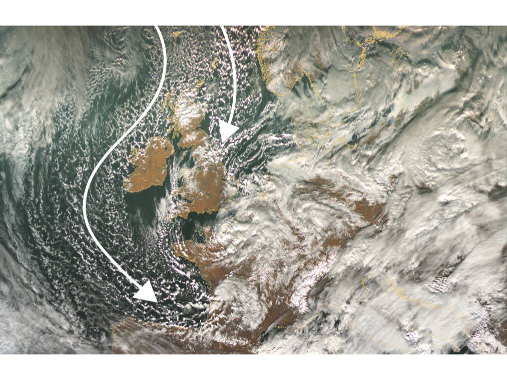 De noordwestelijke stroming voert koude arctische lucht naar het zuiden. Met name in nazomer, herfst en vroege winter ontstaat er een groot temperatuurverschil tussen het relatief warme zeewater en de koude bovenlucht. Deze situatie is instabiel en er ontwikkelen zich sterke, verticale bewegingen. In warme stijgbewegingen condenseert de waterdamp tot wolken en ontstaat er regen, in de daalbewegingen droogt de lucht uit en ontstaan er opklaringen. Zo ontstaan er talrijke buien die zich in een soort honingraatstructuur organiseren, convectiecellen genoemd (Figuur 2). De stroming voert de winterse buien het land op en als de instabiliteit groot genoeg is, gaan ze zelfs gepaard met onweer (Figuur 3).