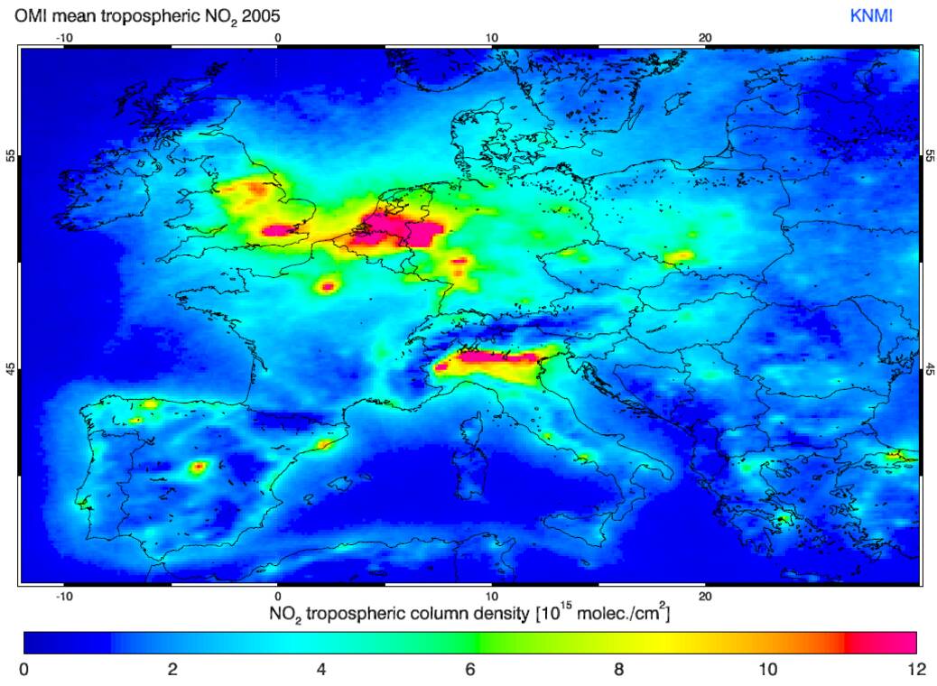 Met het ozonmeetinstrument OMI aan boord van die Aura-satelliet zijn deze beelden van luchtkwaliteit gemaakt. Het KNMI heeft de wetenschappelijk leiding van OMI.