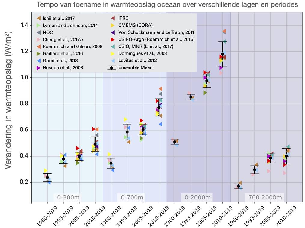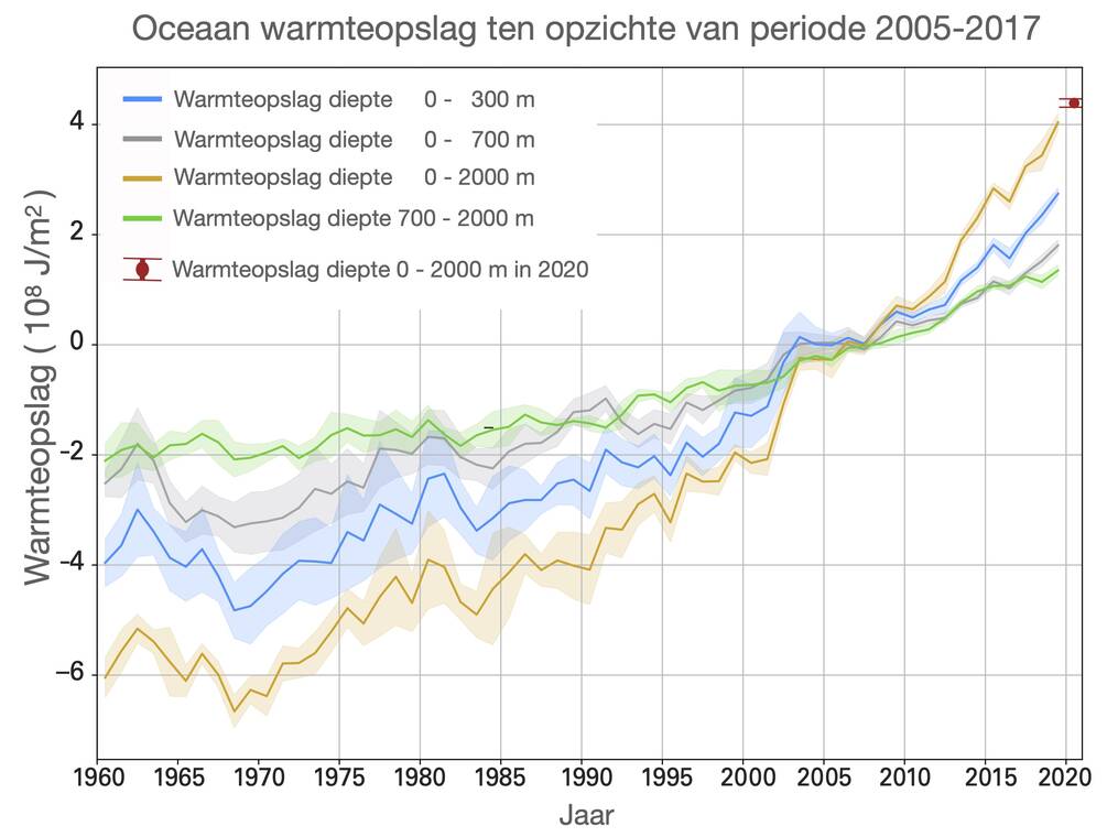 Van de energie die de aarde vasthoudt door het versterkte broeikaseffect komt ruim 90 procent als warmte in de oceaan terecht. De toename van de warmteopslag in de oceaan is daarom een goede maat voor klimaatverandering. De warmteopslag in de oceaan neemt gestaag toe (figuur 1). Bijna elk jaar is de warmteopslag groter dan ooit sinds het begin van de metingen. De warmteopslag wordt uitgedrukt in Joules per vierkante meter. Hoe steiler de helling van de lijnen in figuur 1, hoe sneller de hoeveelheid warmte in de bijbehorende waterlaag toeneemt.