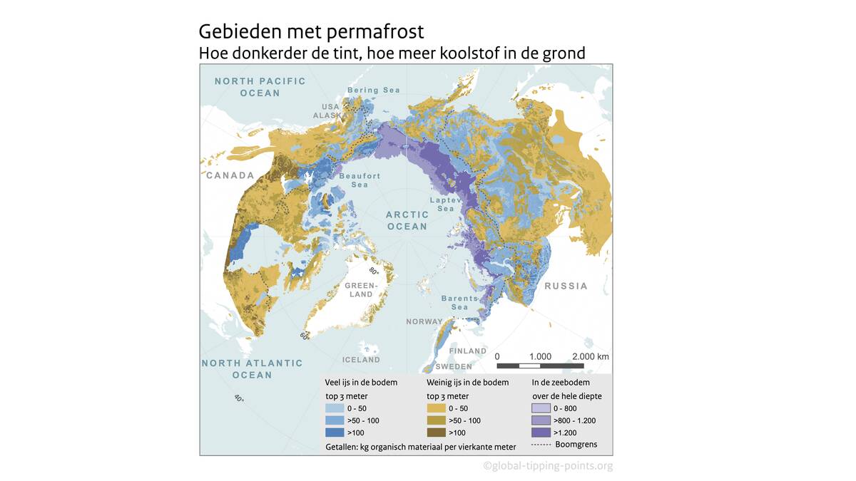 In de permafrost zitten planten- en dierenresten ingevroren, op veel plekken vergezeld met grote hoeveelheden ijs (blauwe gebieden in afbeelding 1). Als de permafrost ontdooit gaan deze resten ontbinden en komt er koolstofdioxide vrij, een broeikasgas dat ook vrijkomt bij de verbranding van fossiele brandstoffen. Naar schatting zit er in de bovenste drie meter van de permafrost 1,5 keer zoveel koolstof als de totale hoeveelheid koolstof die nu als koolstofdioxide in de lucht zit. Naast koolstofdioxide komen er afhankelijk van de lokale omstandigheden ook andere broeikasgassen vrij als methaan en lachgas.