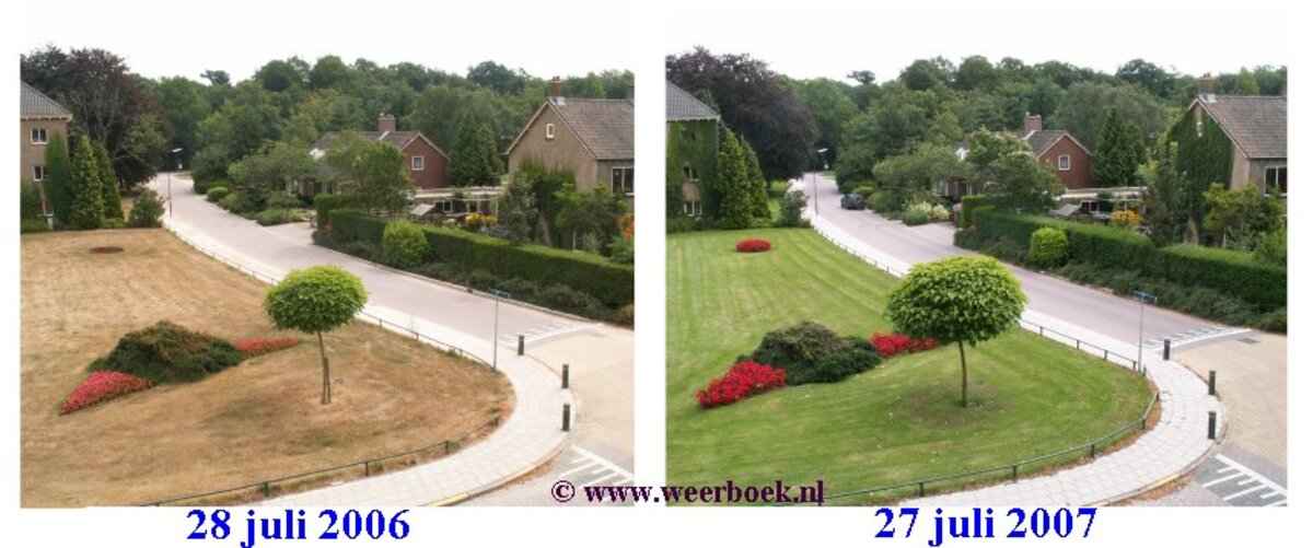 Juli 2006 was recordwarm en kurkdroog, juli 2007 heel nat met normale temperaturen. Het grillige Nederlandse weer tekent zich ook af in de natuur. De boom rechtsonder op de foto gemaakt in De Bilt profiteert goed van de vele regen.