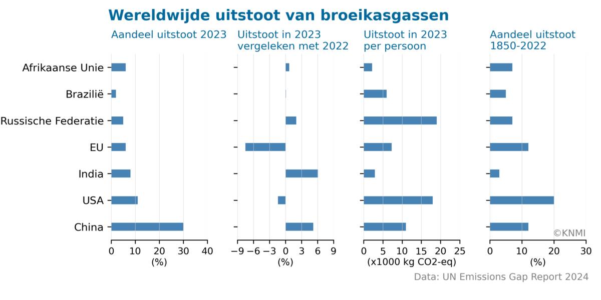 Deze inspanningen zijn echter niet voldoende. Ondanks deze vooruitgang blijft de wereldwijde uitstoot van broeikasgassen stijgen. De wereld heeft in 2023 een nieuw record aan broeikasgassen uitgestoten (57 gigaton) en het gebruik van fossiele brandstoffen blijft nog steeds toenemen, met name in India en China. De uitstoot in de VS en de EU is weliswaar aan het dalen, maar de uitstoot per hoofd van de bevolking ligt er echter nog steeds veel hoger dan gemiddeld in de wereld. Ook historisch gezien hebben deze landen een zeer groot aandeel in de totale uitstoot van broeikasgassen sinds 1850. Doordat de wereldwijde uitstoot blijft stijgen, ligt de wereld bij lange na niet op koers om de opwarming tot 2 graden te beperken, laat staan tot 1,5 graden (afbeelding 2).