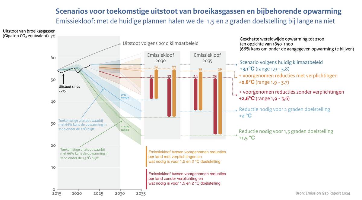 Landen hebben afgesproken om in het voorjaar van 2025 nieuwe plannen in te dienen om de uitstoot van broeikasgassen verder terug te dringen. Deze plannen beslaan de komende tien jaar tot 2035. Alleen met een zeer vooruitstrevend en ambitieus beleid, en met het werkelijk uitvoeren van alle beloftes en afspraken kunnen we zorgen dat de opwarming van de aarde tot een minimum beperkt wordt. En daarbij geldt dat elke tiende van een graad helpt. Want hoe groter de opwarming, hoe groter de impact en hoe meer we ons moeten aanpassen.