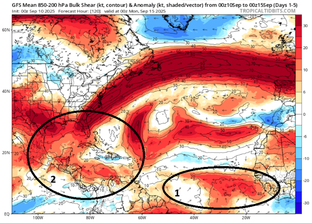 Dat er nu zo veel windschering is, is opmerkelijk; in deze periode is er meestal juist weinig windschering boven de Atlantische oceaan is. De rode gebieden in Figuur 1 zijn gebieden waar op dit moment meer windschering is dan normaal; de omcirkelde gebieden zijn gebieden in deze periode van het orkaanseizoen orkanen zouden kunnen vormen. Maar wat we zien is dat precies in die gebieden er nu juist veel windschering is, waardoor stormen moeite hebben om door te groeien tot orkanen.