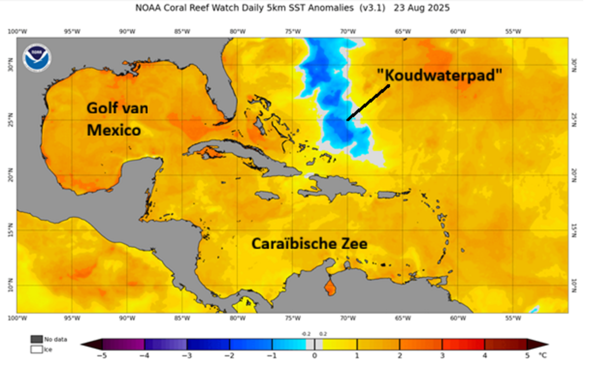 Daarnaast zorgt de afwezigheid van orkanen ervoor dat het water goed warm kan blijven. Orkanen hebben zeewater van minstens 27 graden Celsius nodig om te kunnen ontstaan en door te kunnen groeien. Wanneer een orkaan over het warme zeewater trekt, neemt het de energie uit het zeewater in zich op, en trekt daarbij als het ware ook koud zeewater van dieper in de oceaan naar boven. Hierdoor koelt het oppervlaktewater af, waardoor de orkaan een soort 'pad' van koud water achterlaat in de oceaan. Dit zagen we bijvoorbeeld met orkaan Erin, toen deze als categorie-5 orkaan voorbij de Bahama’s trok (Figuur 2). Het gevolg van deze 'koudwaterpaden' is dat een nieuwe orkaan in dit gebied minder energie tot z’n beschikking heeft, waardoor het moeilijker wordt door te groeien. Maar, doordat er nu juist geen orkanen zijn, blijft het oceaanwater warm en is er dus meer energie beschikbaar voor een mogelijke volgende orkaan.