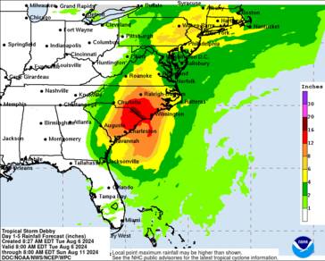 Storm Debby trekt op dit moment (vrijdag 9 augustus) over het oosten van de Verenigde Staten. De storm is inmiddels afgezwakt tot een depressie maar zorgt nog steeds voor overvloedige regenval in delen van Amerika. De hoogste neerslaghoeveelheden als gevolg van Debby zijn vooralsnog gemeten in Lake City, Florida (490 mm) en Summerville, South Carolina (460 mm). De verwachting is dat in de kustgebieden van North en South Carolina, waar ook Summerville ligt, er vandaag nog 25 à 75 mm neerslag bij kan gaan vallen. Het National Hurricane Center (NOAA) verwacht tevens overvloedige neerslag en mogelijke overstromingen in het noordoosten van de Verenigde Staten als de storm daar de komende uren over trekt.
