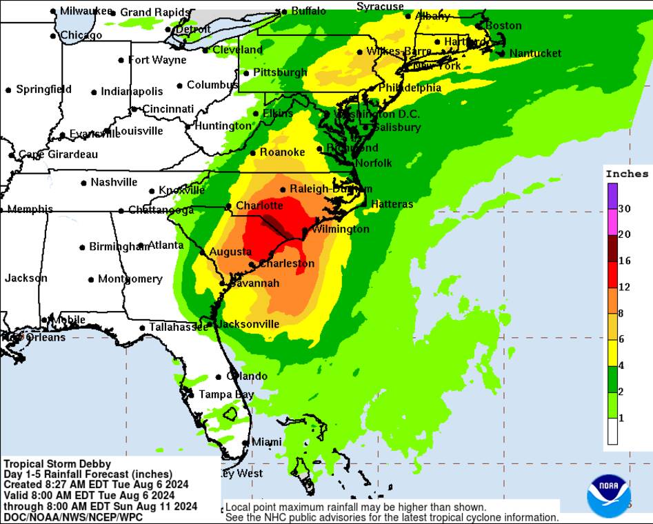 Dit komt doordat Debby een echte “regenmaker” is: in de Amerikaanse staten Georgia, South en North Carolina zal er de komende dagen op grote schaal tot wel 500 millimeter neerslag kunnen gaan vallen. Lokaal wordt er zelfs rekening gehouden met ruim 600-700 millimeter.
