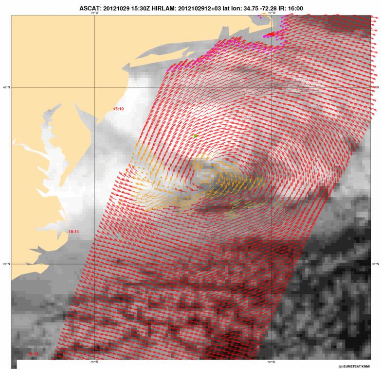 KNMI-orkaandeskundige Ad Stoffelen heeft het verloop van Sandy op de voet gevolgd. “De eerste satellietmetingen van de nieuwe Europese MetOp-B satelliet lieten ons een goed beeld zien van de uitgebreidheid van de storm en het uitstromen van de koude lucht vanaf het land juist ten zuiden van de kern van het lagedrukgebied. Ook de windmetingen van voorganger MetOp-A 50 minuten eerder gaven een goed beeld van de storm voordat ze aan land ging.” Deze KNMI-gegevens worden intensief door het NOAA Operational Prediction Centre en National Hurricane Centre gebruikt voor storm en orkaanverwachtingen.