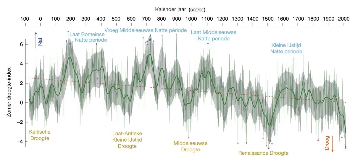 Volgens de bomen is droogte in Europa erg wisselend geweest maar neemt deze langzaam toe in de laatste duizend jaar (figuur 1). Klimaatmodellen zijn nog niet in staat deze variaties te reproduceren. Veranderingen in de oceaan spelen hierbij waarschijnlijk een rol. De oceaan kan namelijk de wind boven Europa beïnvloeden. Wel is duidelijk dat de recente sterke opwarming van de aarde tot grotere kansen op droge periodes heeft geleid door toegenomen verdamping. Ook in de boomringen grafiek zien we Europa in de laatste honderd jaar sterker uitdrogen.