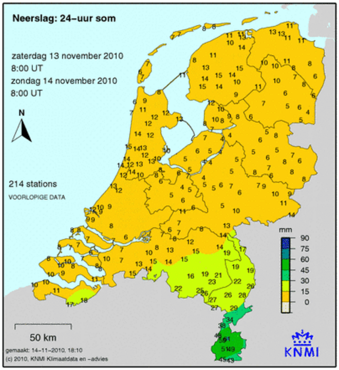In het zuidoosten van Nederland is tussen vrijdagochtend 12 november en zondagochtend 14 november op grote schaal tussen de 30 en 80 mm neerslag gevallen. Lokaal is er in Zuid-Limburg zelfs 90 tot 100 mm gemeten, een hoeveelheid die op een willekeurige plek in Nederland eens in de honderd jaar kan worden verwacht. De grote hoeveelheid neerslag is veroorzaakt door een front dat langdurig stil lag boven het zuiden van het land.