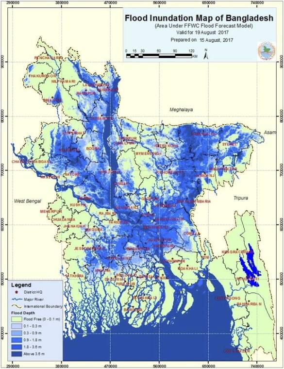 Augustus is midden in de natte moesson in Bangladesh, maar in 2017 regende het nog veel meer dan anders in het stroomgebied van de Brahmaputra, in Bangladesh, India en Butan. Hierdoor trad de rivier buiten haar oevers en veroorzaakte grote overstromingen (figuur 1). Om te onderzoeken hoe groot de kans op een dergelijke gebeurtenis is en of deze kans aan het veranderen is, hebben we 10-daags gemiddelde regen in dit stroomgebied onderzocht in waarnemingen en klimaatmodellen. Normaal gesproken duurt het namelijk zo'n tien dagen voordat water de overstroomde gebieden bereikt. Daarnaast hebben we ook de afvoer van de Brahmaputra geanalyseerd, deze wordt waargenomen in Bahadurabad en gemodelleerd met hydrologische modellen.