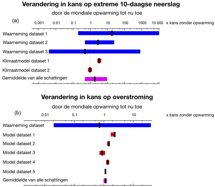 De invloed van klimaatverandering tot nu toe is nog onzeker (figuur 2). Twee van de drie datasets met waarnemingen laten een lichte toename zien van de kans op extreme regen, maar met een onzekerheidsmarge die ook een lichte afname omvat. De derde dataset laat vrijwel geen verandering zien, maar met nog grote onzekerheden. Van de twee modellen die we gebruikt hebben en die het regenklimaat in dit deel van de wereld redelijk goed kunnen nabootsen, geeft één een toename maar de andere geen verandering. Het verschil wordt verklaard door de invloed van luchtvervuiling in deze modellen. De toenemende luchtvervuiling maskeert in Zuid-Azië vaak de effecten van broeikasgassen, maar hoeveel is moeilijk te bepalen.