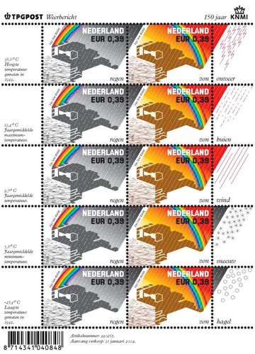 Al 150 jaar vervult het KNMI een bijzondere maatschappelijke betekenis in Nederland. Meteoroloog C.H.D. Buys Ballot (1817-1891) nam destijds het initiatief tot oprichting van het KNMI in Utrecht. Hij was wereldberoemd door zijn wet over het verband tussen luchtdruk en wind en was één van de eerste meteorologen die weerkaarten tekende. Hij was ook grondlegger van de internationale samenwerking in dit vakgebied. Het instituut heeft aan de wieg van veel ontwikkelingen in de meteorologie gestaan. Het heeft bijvoorbeeld als één van de eerste in de wereld met stormwaarschuwingen en weerkaarten gewerkt. De weerkaart is nog steeds een belangrijk hulpmiddel. In de weerkamer in De Bilt worden tegenwoordig postzegelkaartjes gebruikt. Daarmee bedoelen de meteorologen de verzameling weerkaarten van de verschillende scenario's voor de weersverwachting. Een van de hoofdactiviteiten van het publieke KNMI is het geven van waarschuwingen met het oog op veiligheid. KNMI onderzoekers krijgen steeds meer vat op het voorspellen van de ingewikkelde fysische processen en het klimaatsysteem. Ook als klimaatinstituut speelt het KNMI een leidende rol, zeker de laatste decennia nu klimaatproblematiek hoog op de politieke agenda staat.Het postzegelvelletje bestaat uit tien gegomde postzegels (à 0,39 euro per postzegel) met twee verschillende ontwerpen. De ene zegel laat een grijs Nederland in de regen zien. De andere postzegel toont ons land in de zon. De fascinatie van Nederlanders voor het weer is groot: we willen er het liefst zo veel mogelijk informatie over hebben. De postzegels hebben daarom een bijzondere dimensie: op de sluitzegels staan aan de linkerkant van het velletje allerlei 'weetjes over het weer', zoals de hoogst en laagst gemeten temperatuur in Nederland. Aan de rechterkant presenteren de sluitzegels diverse weertypen als onweer, sneeuw, zon en wind. Wanneer je een kaart of brief schrijft kun je zo de geadresseerde informeren over de weersomstandigheden ter plaatse: de regengrijze postzegel met de sluitzegels mist, regen en wind laat niets te raden over. Het actuele weerbericht in postzegels dus!