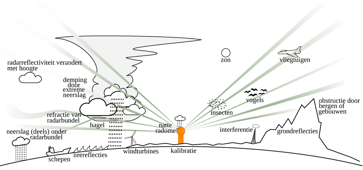 Een radar zendt elektromagnetische pulsen uit, die deels worden gereflecteerd als ze neerslagdeeltjes zoals sneeuwvlokken of regendruppels tegenkomen. Vervolgens wordt een deel van die gereflecteerde straling opgevangen door de radarantenne. Dit wordt daarna omgerekend naar een regenintensiteit. De golven reizen met de lichtsnelheid. Bovendien is de tijd tussen het uitzenden en ontvangen van een puls bekend. Hiermee kan vervolgens de afstand van de neerslag tot de radar worden berekend. Door de antenne 360 graden rond te draaien, wordt een landsdekkende kaart van de regenintensiteit verkregen.