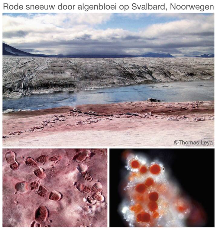 Er bestaat namelijk een bepaald type roodkleurige alg dat zich prima thuis voelt in de sneeuw. In de winter houden deze algen zich koest, maar zo gauw de lente aanbreekt komen ze tot bloei en geven ze de sneeuw een typisch rozerode kleur (figuur 1). Een mooi beeld voor de argeloze toerist, maar voor de sneeuw of gletsjer is het het zoveelste effect dat de afsmelting doet toenemen. Dat blijkt uit onderzoek op diverse locaties in het noordpoolgebied (figuur 2).