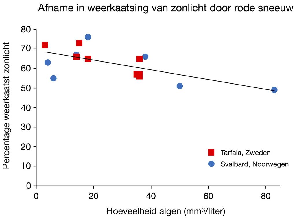 Wat is het geval? Door de rode kleur van de sneeuwalgen wordt er minder zonlicht door de sneeuw gereflecteerd. Een groter deel van de zonne-energie wordt door de sneeuwlaag opgenomen, die daardoor opwarmt en verder afsmelt. Minder koude sneeuw leidt weer tot verdere algenbloei, enzovoorts. Door deze toenemende algenbloei kan de reflectiviteit van de sneeuw met wel 13% afnemen (figuur 3), wat een sterke toename in afsmelting veroorzaakt.