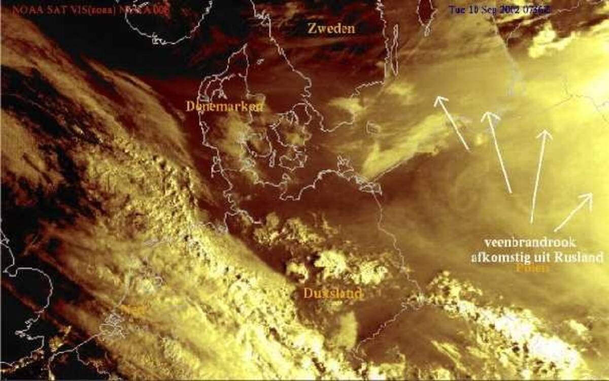 Hoewel het waarschijnlijk wel vaker is voorgekomen, is het transport van rook vanuit Oost-Europa naar onze omgeving, vrij uniek. Dankzij de moderne observatietechnieken is een en ander goed te volgen. Op 12 september rookten de Russische veengebieden nog steeds. De satelliet legde keihard vast waar de smeulende rook weer nieuwe pluimen vormde. Die 12e september was in ons land juist een knalblauwe lucht te aanschouwen. De lucht uit de zuidelijke Oostzee was vervangen door schone Scandinavische lucht die bijzonder doorzichtig was. Een enorm contrast in zicht en uiterlijk van de hemel in een tijdspanne van slechts 12 uren.