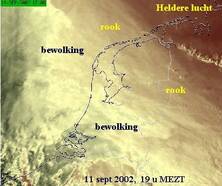 Op dat moment, (11 september, 19 uur lokale tijd) is boven het westen van Nederland een tamelijk dikke witte massa te zien. Grotendeels is dat laaghangende bewolking waar de zon vrijwel niet doorheen dringt. Het oosten en noordoosten van het land is ook bedekt door een witgetinte massa, die echter veel minder dicht van structuur is. Die dunnere sluier is de rooksluier die het zonlicht sterk dempt. Het uiterlijk van de hemel was wit, waarbij het leek of er mist hing. De zon drong moeizaam door die smerige sluier heen. Iets meer oostwaarts is heel duidelijk veel schonere lucht te vinden, herkenbaar aan de donkerder (bruine) tint van het onderliggende land. Boven Noord-Duitsland is nog een rijtje stapelwolken te vinden die kleine buitjes produceerden. De rook boven ons land zat vooral in de onderste 1000 meter van de atmosfeer, opgesloten onder een laag warme lucht, de zogenaamde inversie. Midden op de middag, bedroeg het zicht op KNMI-station Eelde niet meer dan een paar kilometer. Toen 's avonds van het oosten uit de schone lucht binnenstroomde, sprong het zicht omhoog tot meer dan 10 kilometer.