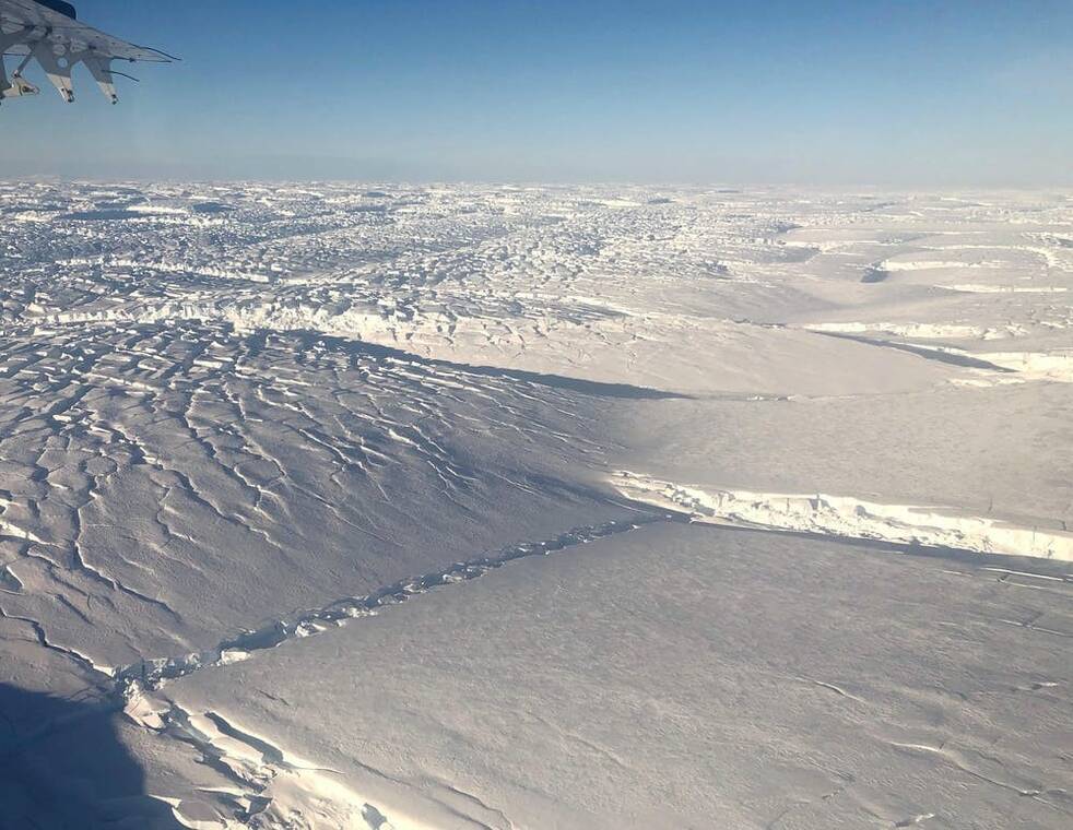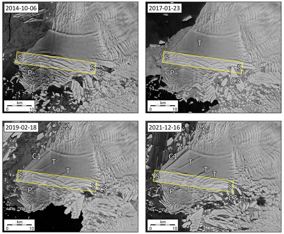 De Thwaites gletsjer in het zuidpoolgebied is zeer moeilijk te bereiken. Drijvende ijsbergen en een dik pak zee-ijs belemmerden nog dit jaar de toegang van een onderzoeksschip naar de gletsjer. Ook is het onverantwoord om met een helikopter in de buurt van de gletsjer te landen door de snelle ijsstroom, het voortdurend ontstaan van scheuren (figuur 1) en het afbrokkelen van ijsbergen. Al met al zijn er maar een handvol directe metingen van dit gebied. Gelukkig zijn er ook satellietbeelden en deze geven de laatste jaren een zorgwekkend signaal. De ijsplaat – het drijvende uitsteeksel van de gletsjer – vertoont sinds 2014 steeds meer en steeds groter wordende barsten (figuur 2).