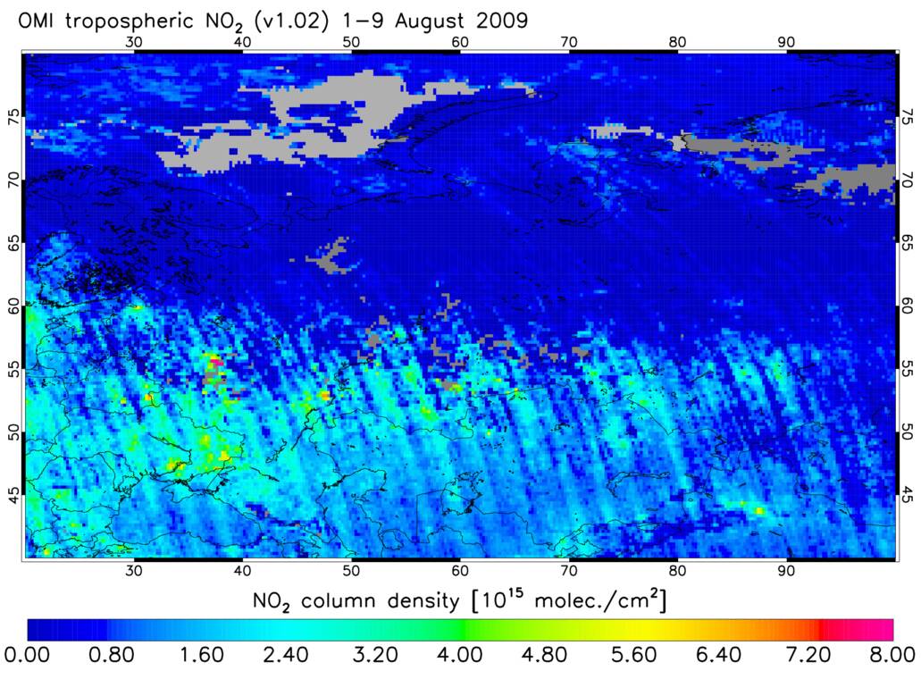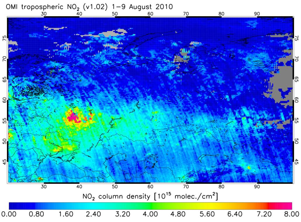 De rook van de bosbranden in centraal Rusland wordt in kaart gebracht door het Nederlands/Finse satellietinstrument OMI. Bij de bosbranden ontstaan rook, koolmonoxide, stikstofoxiden en andere giftige gassen. Met behulp van OMI kan de luchtvervuiling door stikstofdioxide (NO2) actueel worden gevolgd.