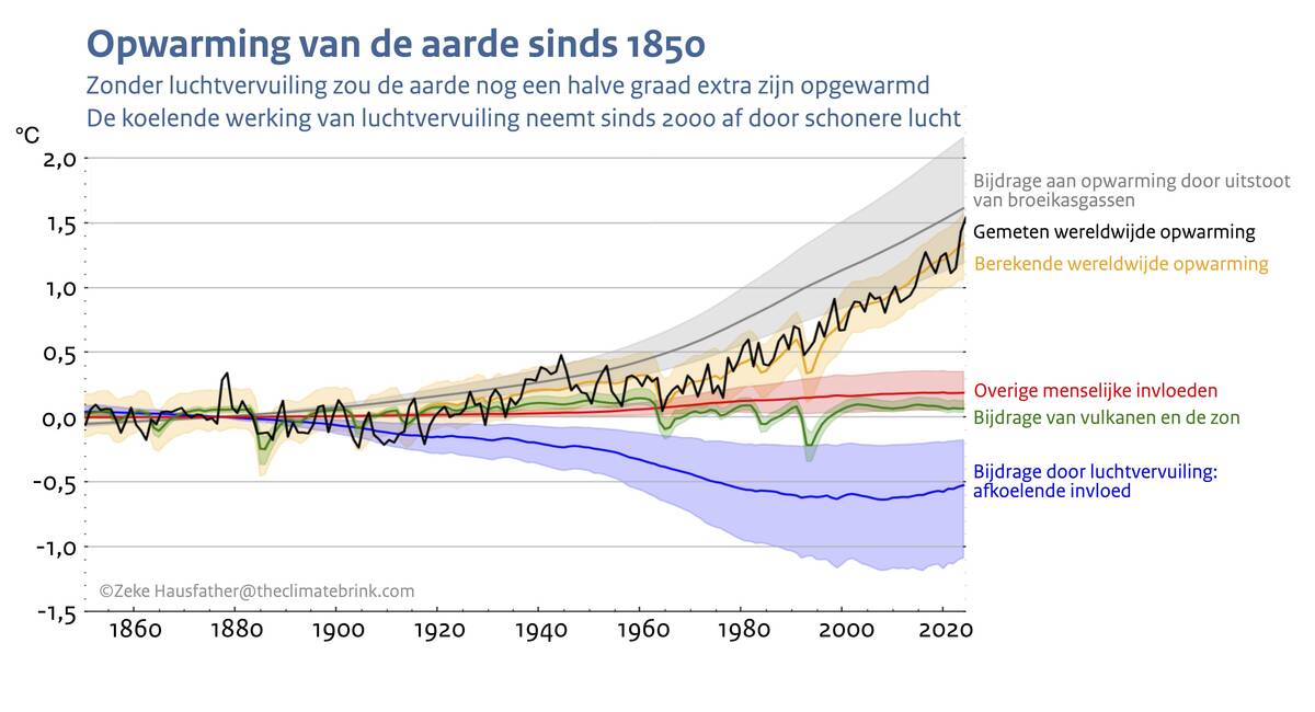 Maar alsnog is het afkoelende effect van aerosolen substantieel: hierdoor is het aardoppervlak naar schatting een halve graad kouder dan het anders zou zijn. Oftewel, zonder het aerosol-effect zou het nu niet 1,5°C warmer zijn dan in de pre-industriële tijd, maar 2°C warmer. Aerosolen hebben dus een deel van de opwarming gemaskeerd.