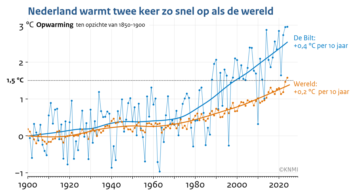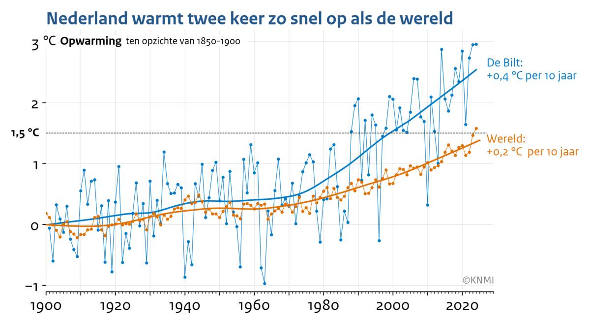 Regionaal kan de invloed van aerosolen groter zijn. In Nederland en Europa is de temperatuur sinds 1980 twee keer zo hard toegenomen als mondiaal gemiddeld (afbeelding 2). Europa warmt het snelst op van alle continenten, en dat komt voor een deel door het schoner worden van de lucht. Daarnaast zijn er ook veranderingen in atmosferische circulatie: de wind komt vaker uit de warme zuidwestelijke richting.